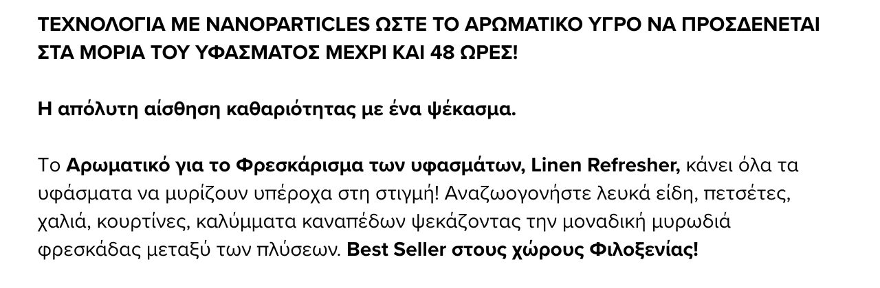 Είστε λάτρης της μυρωδιάς των φρεσκοπλυμένων ρούχων; Ή μήπως της αίσθησης καθαριότητας ενός πολυτελούς ξενοδοχείου; Αν ναι, τότε είστε ένας από τους υποστηρικτές του Fabric Freshener! Η ξεχωριστή αυτή σύνθεση κάνει όλα τα υφάσματα και ρούχα να μυρίζουν υπέροχα στη στιγμή! Αναζωογονήστε λευ..