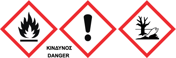 Δηλώσεις επικινδυνότητας: Υγρό και ατμοί πολύ εύφλεκτα. Προκαλεί σοβαρό οφθαλμικό ερεθισμό. Μπορεί να προκαλέσει αλλεργική δερματική αντίδραση. Τοξικό για τους υδρόβιους οργανισμούς, με μακροχρόνιες επιπτώσεις.