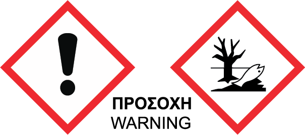 Δηλώσεις επικινδυνότητας: Προκαλεί σοβαρό οφθαλμικό ερεθισμό. Μπορεί να προκαλέσει αλλεργική δερματική αντίδραση. Τοξικό για τους υδρόβιους οργανισμούς, με μακροχρόνιες επιπτώσεις.